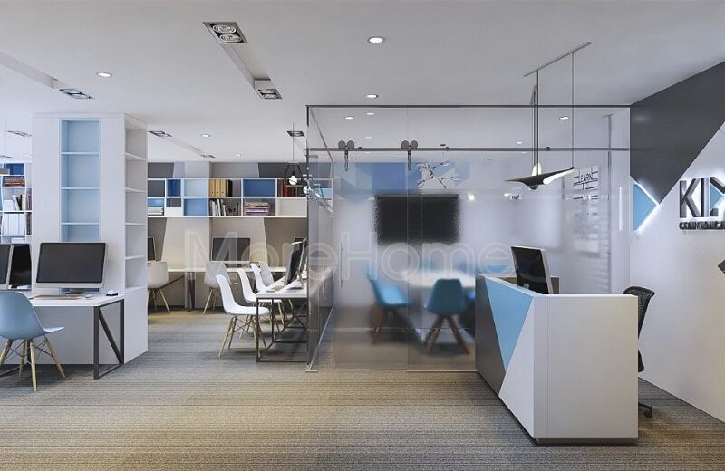 Thiết kế nội thất văn phòng trẻ trung với tông màu chủ đạo trắng xanh mang đến không gian làm việc lí tưởng