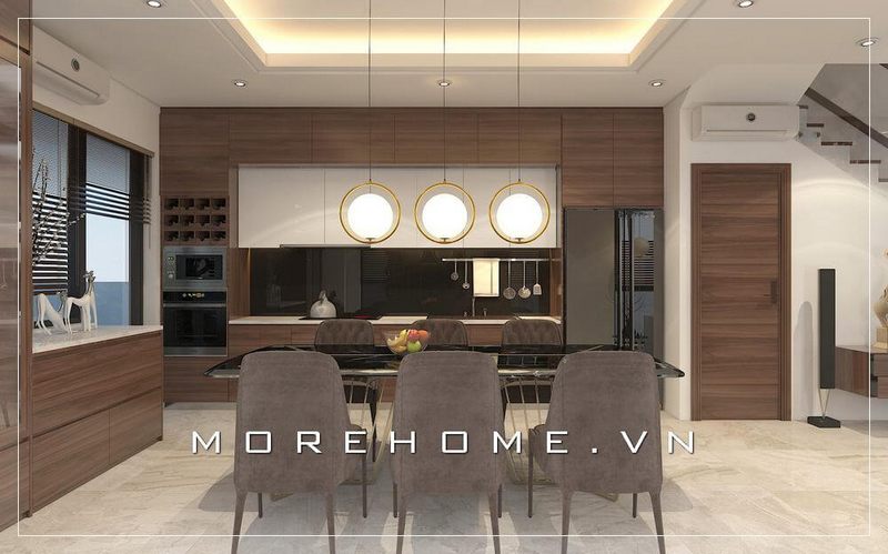 Mẫu tủ bếp gỗ tự nhiên với tone màu nâu trầm tạo không gian phòng bếp ấm cùng kết hợp thiết bị phòng bếp hiện đại tạo sự tiện nghi nấu nướng cho người nội trợ