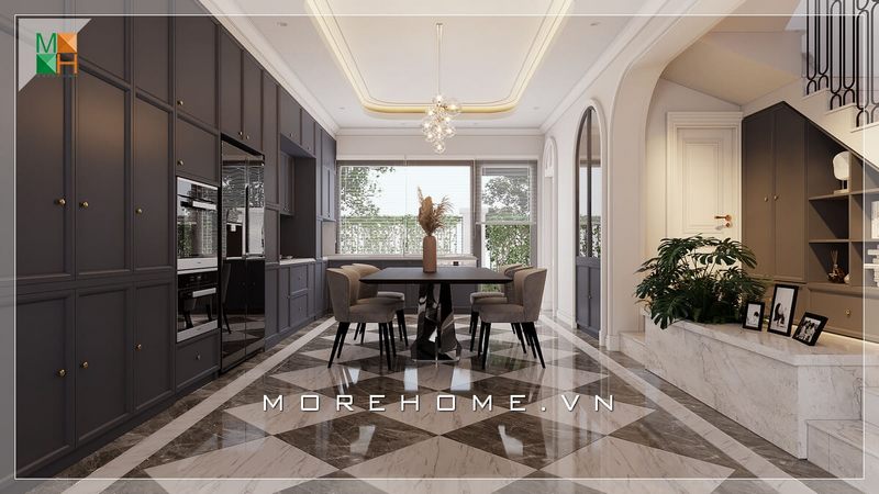Thiết kế kệ tủ dạng vòm với tay nắm tân cổ điển tinh tế mang lại cảm giác sang trọng cho căn bếp