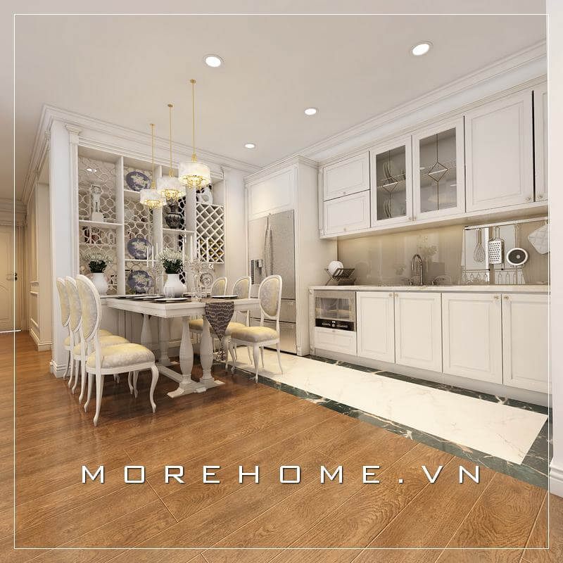 Mẫu tủ bếp gỗ tự nhiên màu trắng tân cổ điển cao cấp cho phòng bếp chung cư