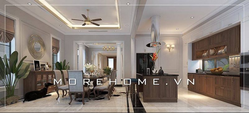 Mẫu tủ bếp gỗ tự nhiên tân cổ điển sang trọng, tiện nghi cho căn bếp biệt thự