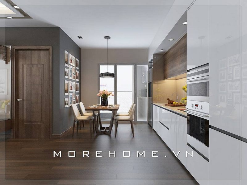 Mẫu tủ bếp chung cư đơn giản kết hợp sư dụng tone màu trắng ấn tượng mang đến cảm giác sạch sẽ, tinh tế nhẹ nhàng, tạo cảm giác cơi nới cho không gian.