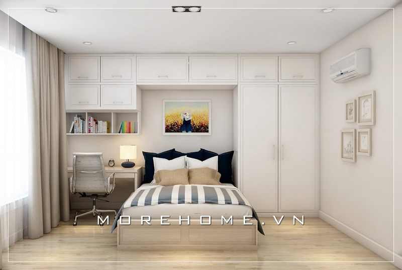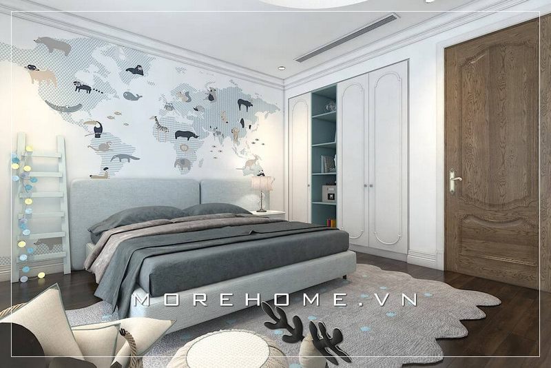 Giường ngủ bé trai hiện đại, gia chủ lựa chọn gam màu xám nhạt tạo điểm nhấn nhẹ nhàng cho cả căn phòng