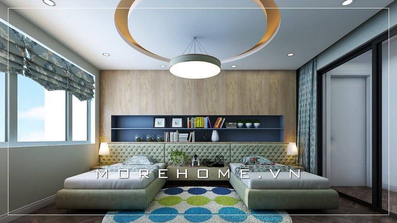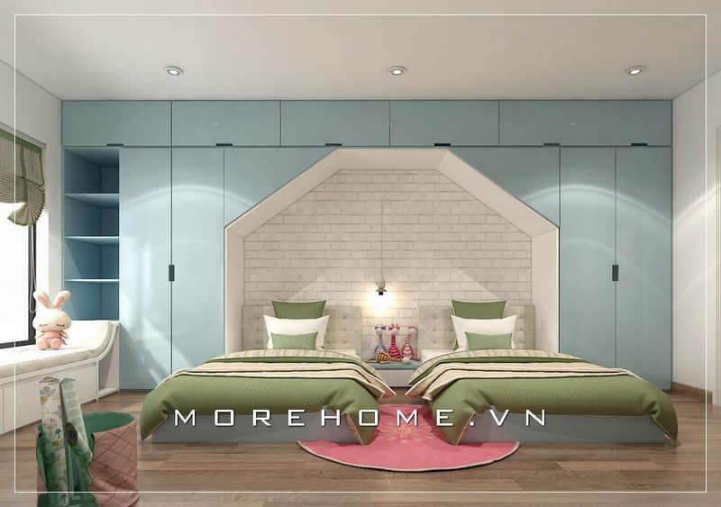 Mẫu giường ngủ trẻ em phong cách hiện đại, trẻ trung, đầu giường thiết kế độc đáo với phần nút múi tạo điểm nhấn ấn tượng cho cả căn phòng