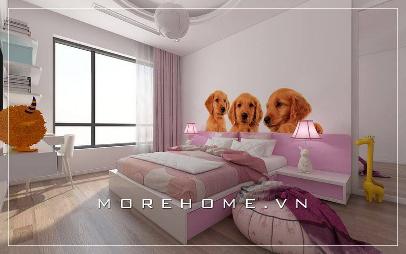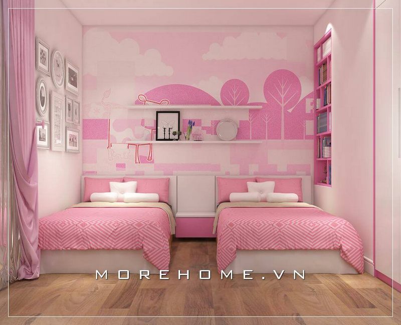 Thiết kế giường ngủ hiện đại, gam màu hồng dễ thương tô điểm cho không gian phòng ngủ bé gái