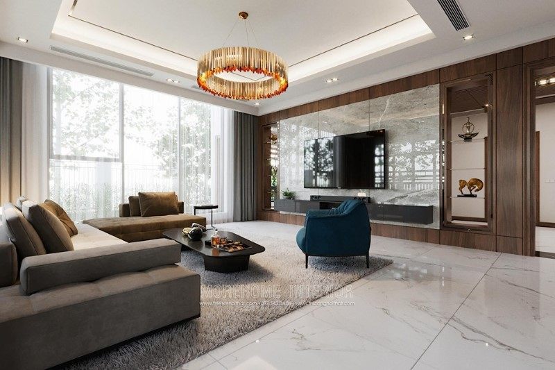 Phong cách tân cổ điển được áp dụng trong thiết kế phòng khách biệt thự đẹp sang trọn là xu hướng thịnh hành trong năm nay.
